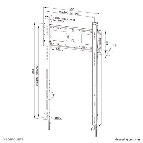 Maximale gewichtscapaciteit: 100 kg, Minimale schermgrootte: 127 cm (50″), Maximale schermgrootte: 2,49 m (98″), Montage interface compatibiliteit (min): 100 x 100 mm, Montage interface compatibiliteit (max): 500 x 800 mm.