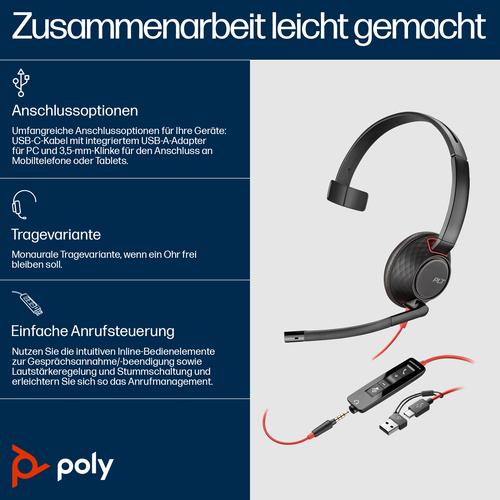 HP Poly Blackwire 5210 mono USB-C-headset + 3,5 mm stekker + USB-C/A-adapter (bulk)