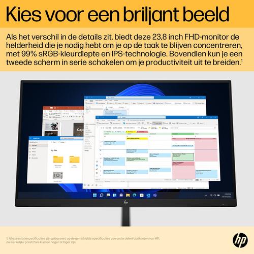 Beeldschermdiagonaal: 60,5 cm (23.8″), Resolutie: 1920 x 1080 Pixels, HD type: Full HD, Display technologie: LCD, Beeldoppervlakte: Mat, Responstijd: 5 ms, Oorspronkelijke beeldverhouding: 16:9, Kijkhoek, horizontaal: 178°, Kijkhoek, verticaal: 178°.