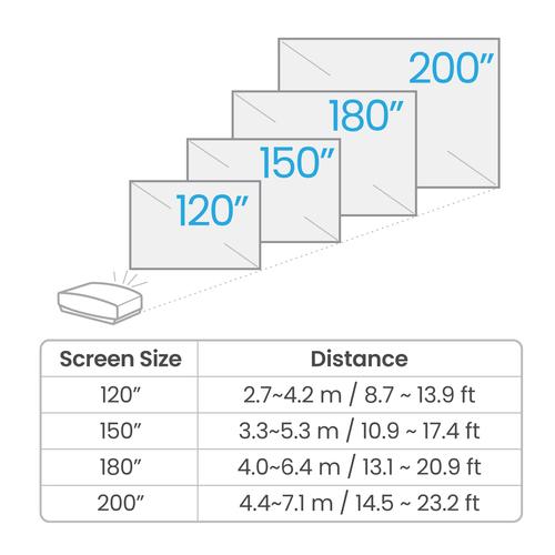 Zoomverhouding: 1.6:1, Throw ratio: 1.0~1.5, Max: 1.0~1.6, Horizontale lens verplaatsingsbereik: -15 – 15 procent.